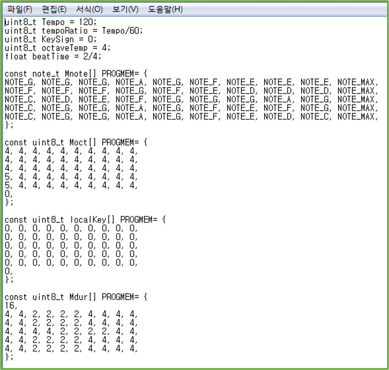 8. note 파일의 멜로디 코드를 복사하여 아두이노에서 피에조 부저를 이용한 멜로디 연주에 사용할 수 있습니다.
